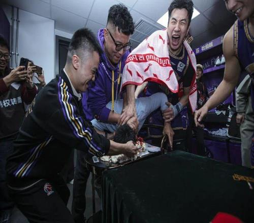 昨天正好是张庆鹏指导的生日,一场大胜无疑是最好的礼物。赛后回到更衣室,球队还给张指导准备了一份惊喜。