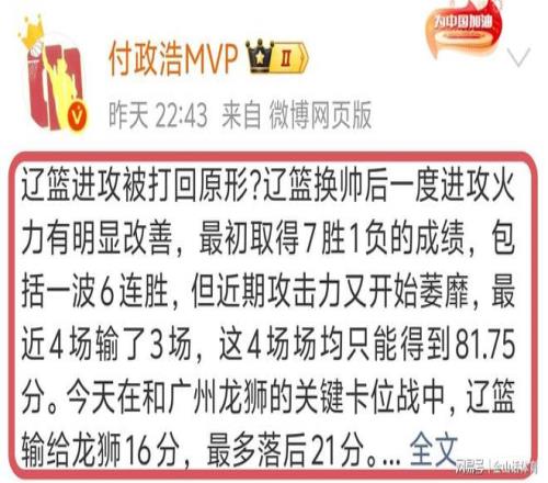 赛后,媒体人付政浩发文表示:辽篮进攻被打回原形?辽篮换帅后一度进攻火力有明显改善,最初取得7胜1负的成绩,包括一波6连胜,但近期攻击力又开始萎靡,最近4场输了3场,这4场场均只能得到81.75分。今天在和广州龙狮的关键卡位战中,辽篮输给龙狮16分,最多落后21分。辽篮本场输龙狮和上一场输吉林男篮如出一辙,内外线对位都处于劣势,有些招架不住、力不从心……