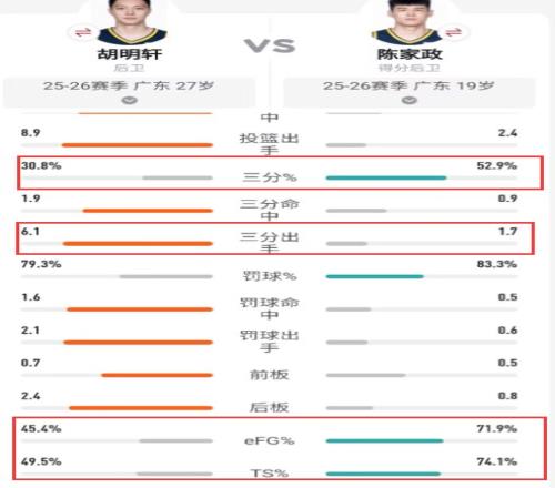 对比投篮、罚球、三分命中率和有效命中率和真实命中率,本赛季陈家政的表现都要比胡明轩好,胡明轩场均出战26.8分钟,只能得到9.7分3.1篮板3助攻,陈家政场均12.2分钟,能拿到4分1.4篮板,如果把胡明轩的出场时间和场均三分出手数给到陈家政,后者的场均得分能翻2倍。