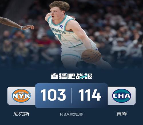 比赛开始,三球连砍8分帮助黄蜂打出不错开局,随后黄蜂外线多点开花,但布伦森各种中距离和杀伤单节17分助尼克斯首节咬到差2分,次节尼克斯进攻端受阻,阿努诺比连续3记三分带队追分,但但小桥和科比·怀特连续突破回应,黄蜂半场领先到10分。下半场,三球和克尼佩尔又是连续4记三分重新拉开比分,布伦森有攻有传继续带队止血,克尼佩尔连续中距离取分助黄蜂领先到18分,末节迪亚巴特各种拼抢,黄蜂一度拉开20分以上领先,哈特连续三分助尼克斯13-4追至个位数分差,但时间所剩无几,最终黄蜂114-103力克尼克斯。
