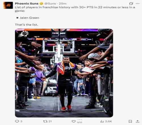 这场比赛杰伦-格林再度创造多项纪录:1.格林拿到太阳生涯第三次30+;
