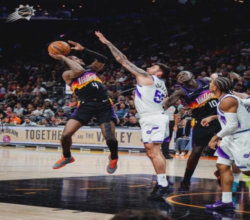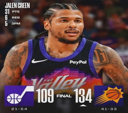 北京时间3月29日,NBA常规赛:太阳134-109大胜爵士。太阳球员杰伦-格林仅出战22分钟,22投13中,三分11中5,0罚球,拿到31分6篮板3助攻0失误。格林上场22分钟拿到30+,成为太阳队史上出场时间最少的一场30+。
