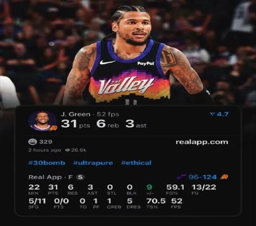 此役杰伦格林首发出战约22分钟,投篮22中13,三分11中5,没有罚球没有失误砍下31分外加6板3助。