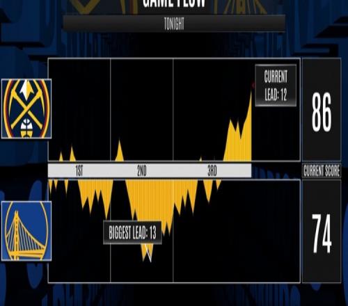 第三节,勇士攻防两端被对手压制,掘金单节轰进8个三分,单节勇士21-40净负19分,三节打完落后12分。