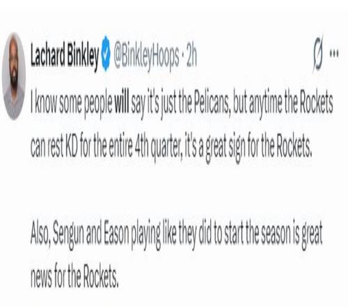 赛后火箭队记兰德里-宾克利写道:我知道有些人可能会说是打羸弱鹈鹕的关系,但只要火箭能够让杜兰特在第四节获得足够长的休息时间,这对于火箭来说就是一个非常好的信号。此外,申京/伊森在终于开始发挥出色,这也是一个积极的信号。