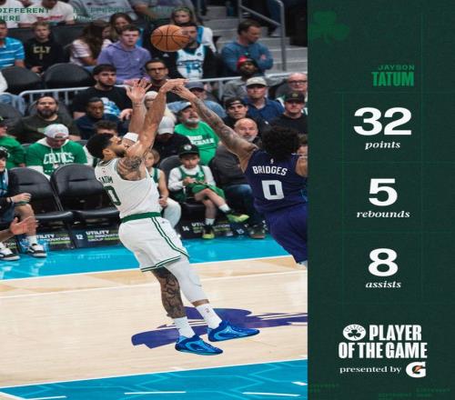 这场比赛塔图姆30分47秒,23中12,三分10中5,罚球5中3,拿到32分8助攻5篮板1盖帽,命中率52.2%,三分命中率50%,真实命中率63.5%,正负值+15,对于塔图姆来说此役是少数的高效场次。