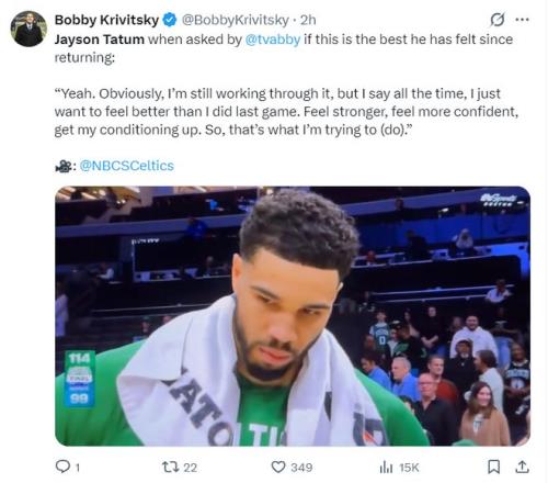 赛后塔图姆接受采访,他表示:这场比赛的确是自己复出以来最佳状态,自己一直都在克服伤病带来的心理恐惧感。我一直告诉自己要比上一场表现出色,要感觉自己更强壮,更有信心,提升我的体能水平。目前我正在逐步的调整与恢复自己的竞技状态。
