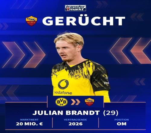 29布兰特与多特蒙德的合同将在今夏到期,而球员本人已经确认不会续约。这意味着,这位在德甲征战多年的攻击手,将以自由身进入转会市场。在如今动辄上亿转会费的时代,一名拥有国家队履历、欧冠经验且仍处当打之年的攻击型中场可以零成本签下,这样的机会本就极为罕见。