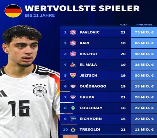 北京时间3月29日,在完成了欧洲五大联赛球员的身价更新之后,德转列出了德国U21球员身价前10,拜仁慕尼黑占据前3...