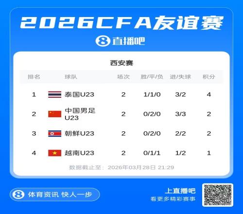 两轮过后,泰国U23排名积分榜第一,国足U23位居积分榜第二,朝鲜U23排名第三,越南U23垫底。