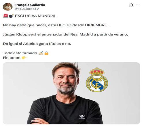 来自西班牙六台记者François Gallardo爆料独家消息,称克洛普确定将于今夏执教皇马。该记者表示,克洛普和皇马在去年12月份就达成了协议,在今年夏天成为皇马的主教练,无论阿韦洛亚是否能够带领皇马夺冠,都不会影响到克洛普的执教,阿韦洛亚将会被解除一线队主教练的位置。这个消息很快就引起了多家媒体的转发报道,但是这个记者此前也多次因为虚假的报道引起了球迷的质疑。