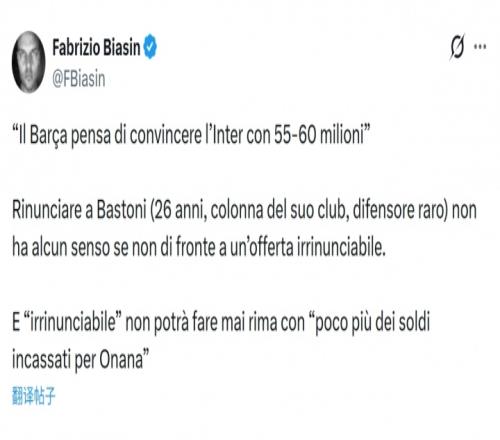 体育播报03月29日宣 意大利记者比亚辛谈到了此前有关于巴萨求购巴斯托尼的报道,并认为5500万至6000万的报价太低了。